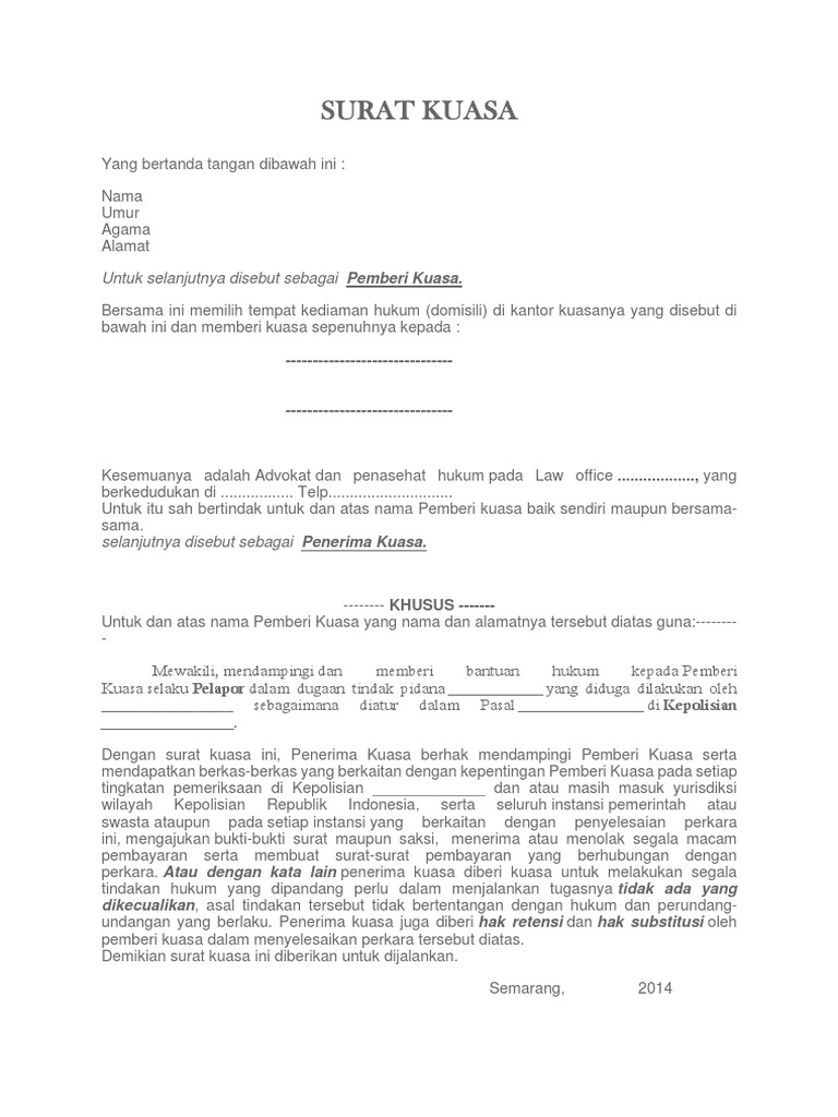 Surat kuasa adalah surat yang isinya mengenai pemberian wewenang atau kuasa dari seseorang atau satu pihak kepada orang lain atau pihak lain untuk melakukan suatu hal seperti yang. Kuasa hukum / penasihat hukum pelapor. Saya yang bertanda tangan di bawah ini Surat kuasa khusus penjualan tanah. Pada dasarnya, surat kuasa memiliki struktur penulisan yang hampir mirip dengan jenis surat lainnya struktur surat kuasa khusus sama seperti surat kuasa lain hanya saja yang membedakan adalah dalam surat kuasa khusus terdapat tindakan.